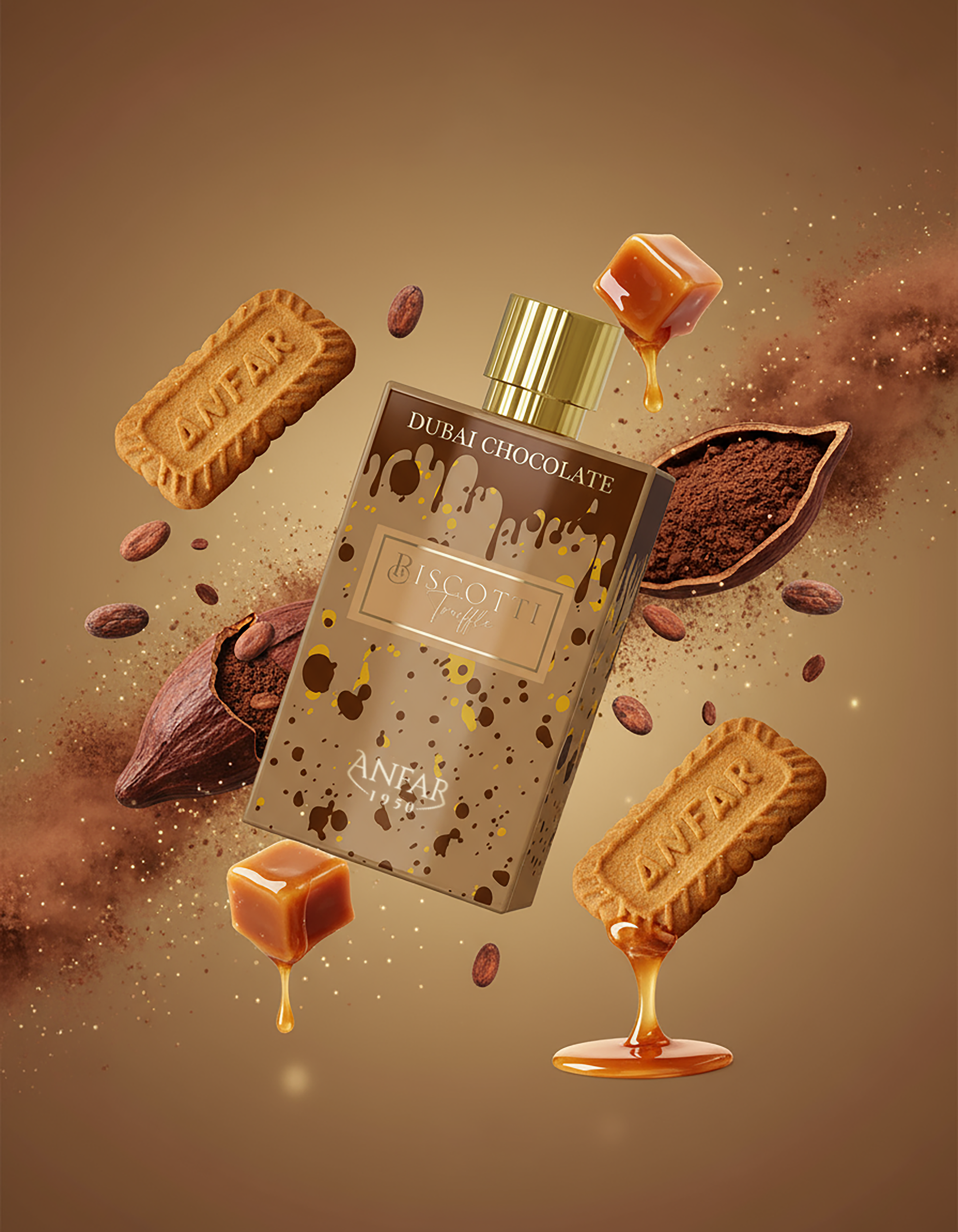 Anfar 1950 Dubai Chocolate Biscotti Truffle is a rich, gourmand perfume that blends spice, sweetness, and luxury in perfect harmony. The fragrance opens with warm Cinnamon, Cardamom, Cocoa, and Bischoff, leading to a creamy heart of Vanilla, Chocolate, and Honey. A smooth base of Caramel and Musk lingers beautifully, adding depth and sensuality.