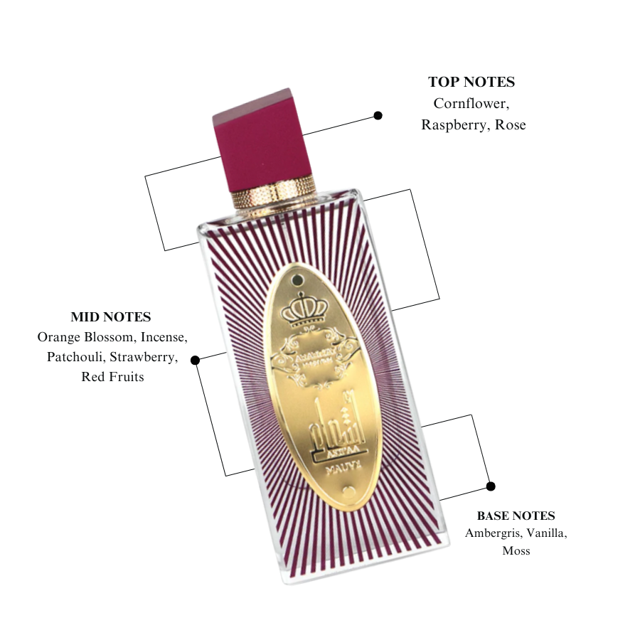 The scent opens with a sweet blend of raspberry and rose, softened by cornflower petals. It transitions to a heart of delicate violet and neroli enriched with soft incense. The dry-down is warm and irresistible, where creamy vanilla meets sensual musk and smooth cashmere — leaving a lasting impression of elegance and charm.