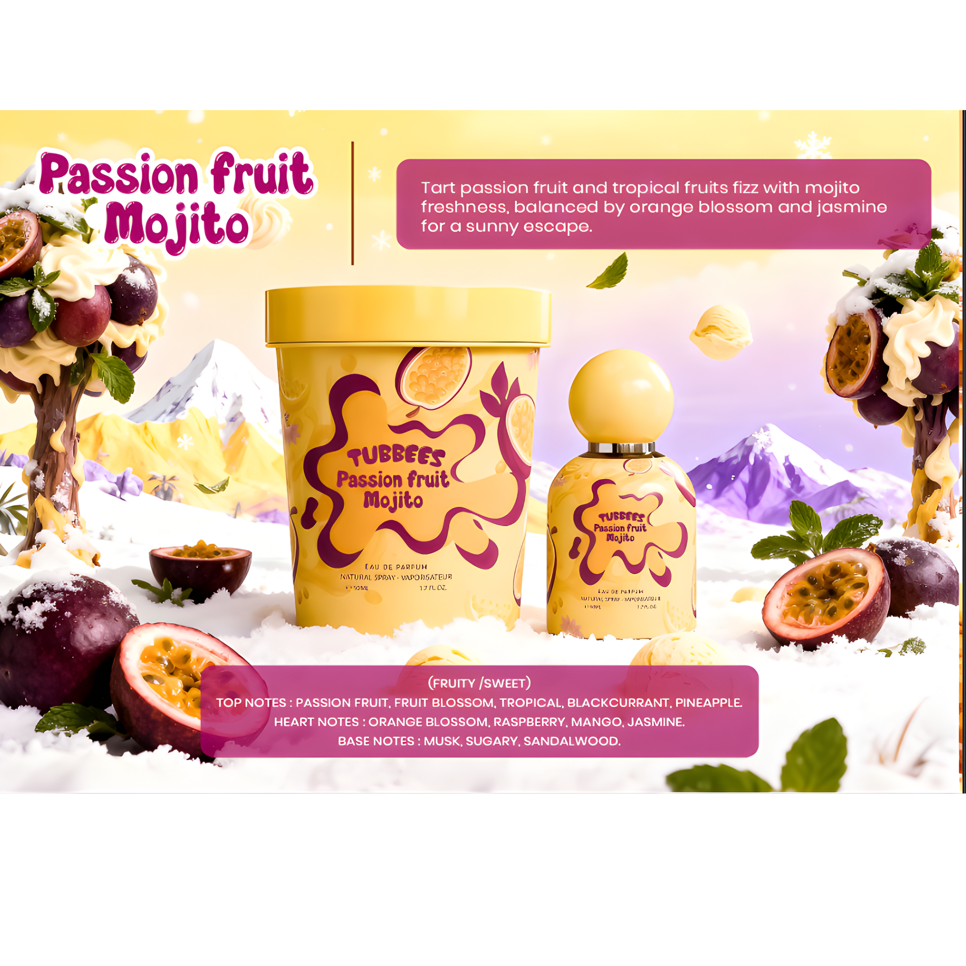 Experience a refreshing getaway with TUBBEES PASSION FRUIT MOJITO. Tart passion fruit and tropical fruits blend with mojito freshness, while orange blossom and jasmine add a sunny touch. Indulge in this 50ml bottle of exotic flavors for a burst of tropical escape.