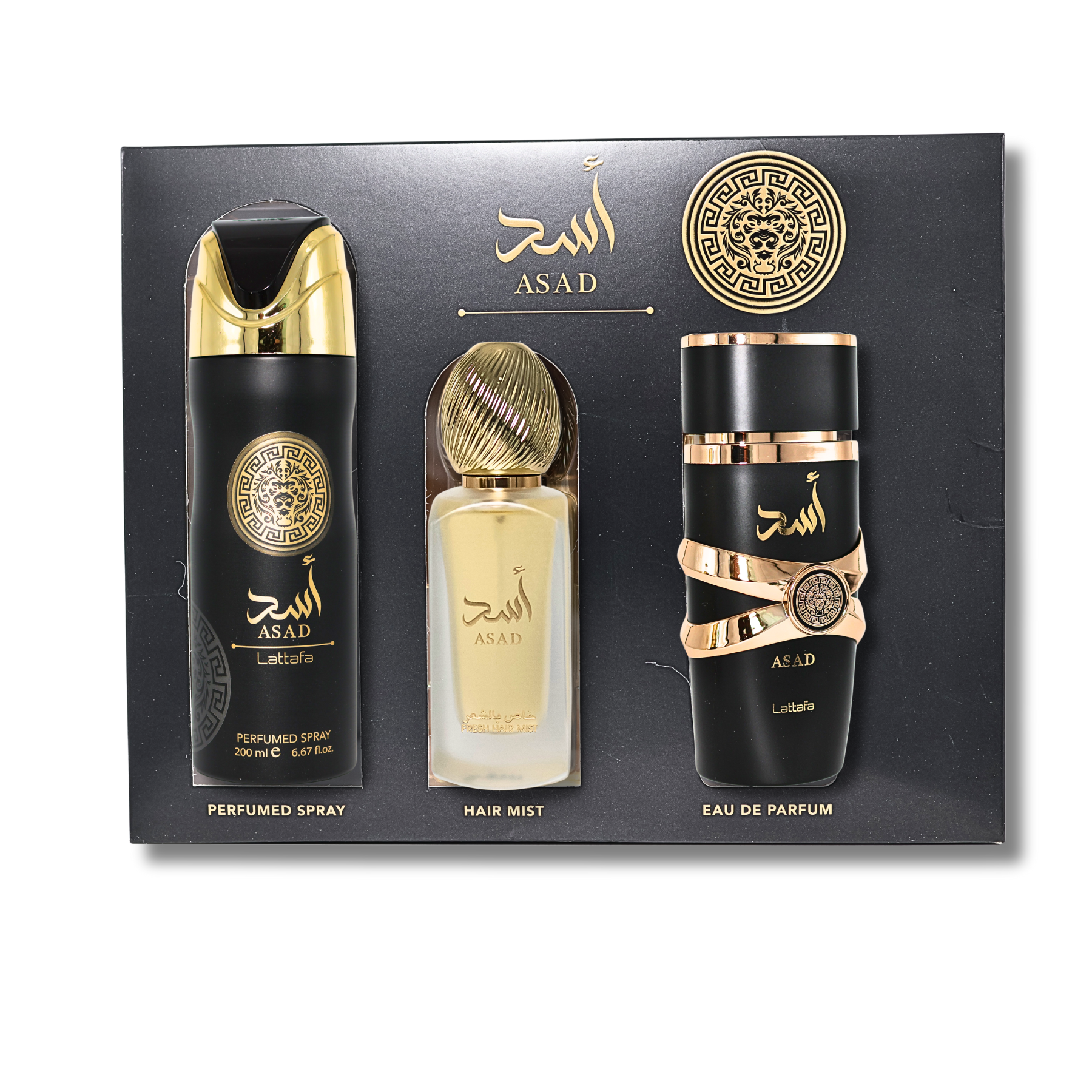 Lattafa Asad 3 Piece Gift Set - Eau De Parfum 3.4FL.OZ, Deoderant 6.67FL.OZ & Hair Mist For Men