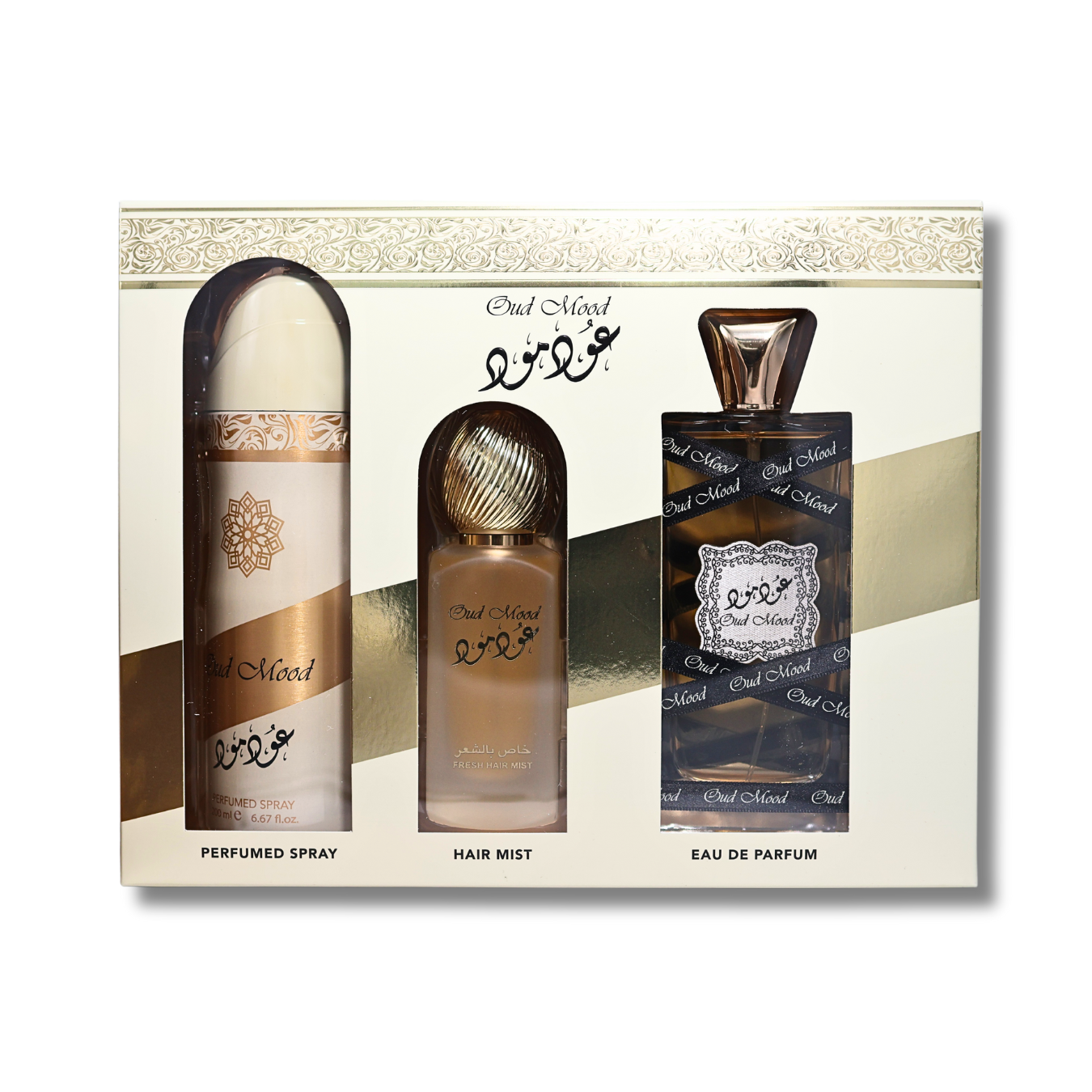 Indulge in the luxurious LATTAFA OUD MOOD Gift Set, featuring a 3.4fl.oz EDP, a perfumed 6.6fl.oz, and a hair mist - perfect for both men and women.