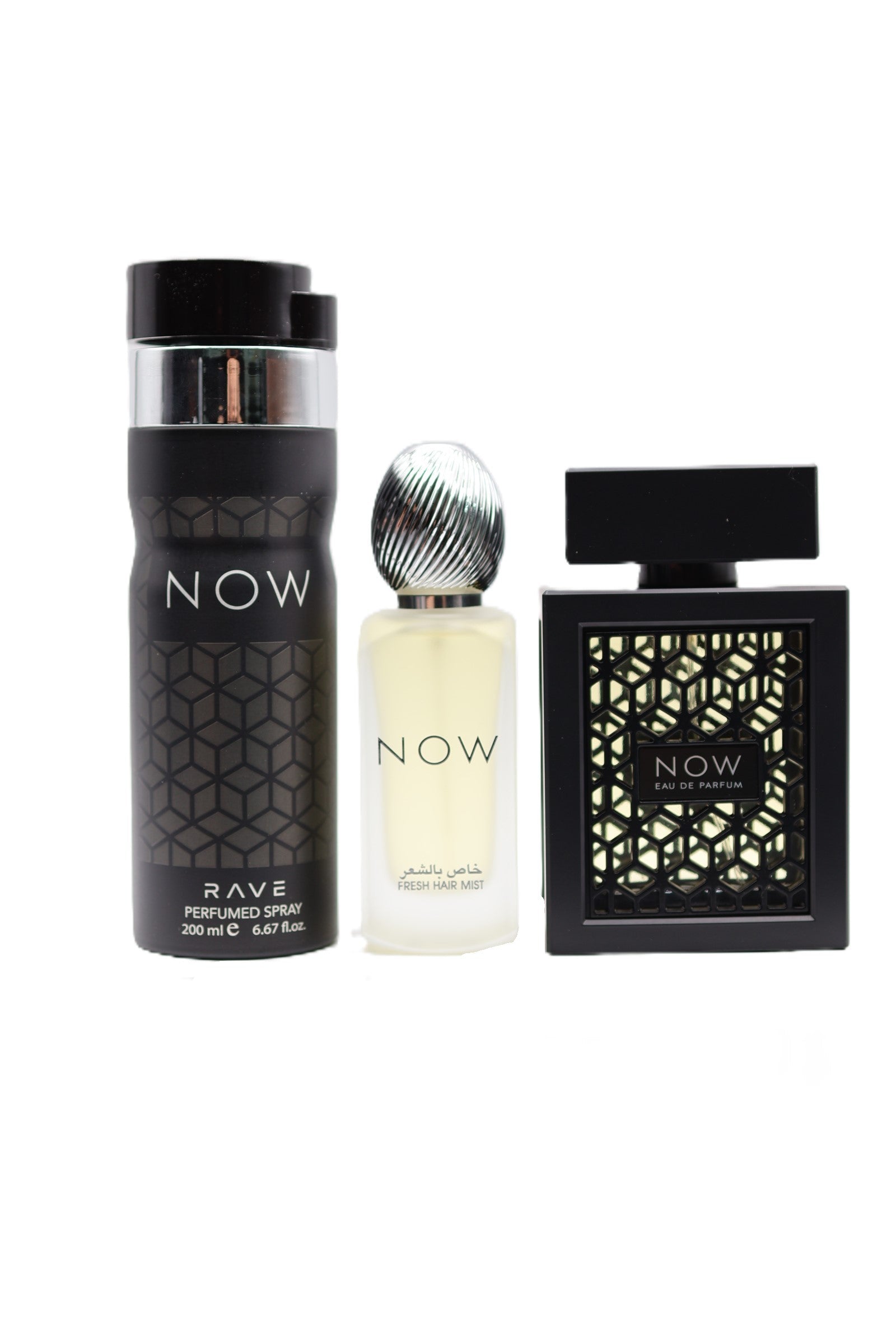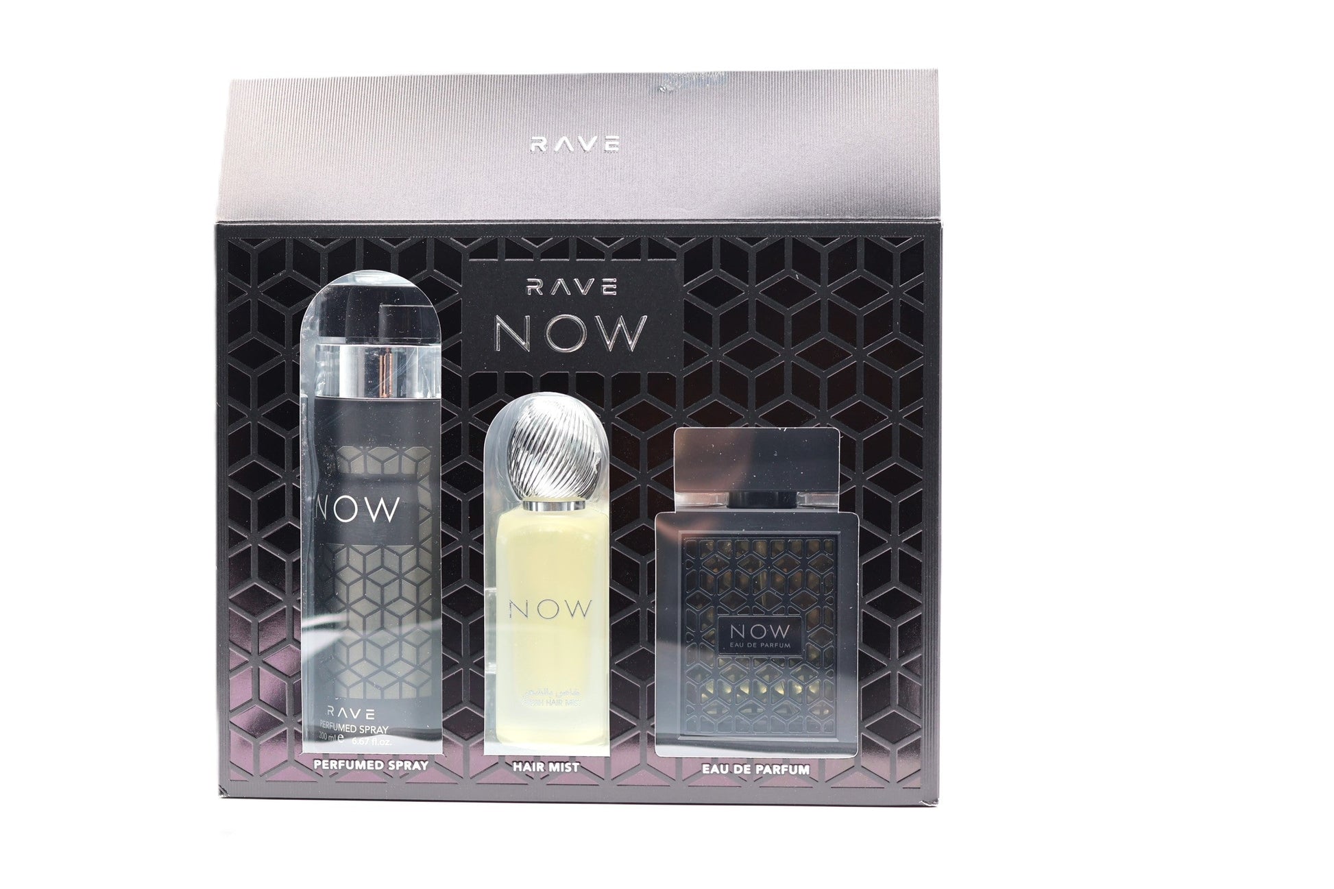 The LATTAFA RAVE NOW COLLECTION is a beautifully crafted perfume set that features an Eau de Parfum, a Deodorant Perfumed Spray, and a Hair Mist. This set is the perfect addition to your beauty and personal care collection, bringing an elegant fragrance experience to your daily routine.