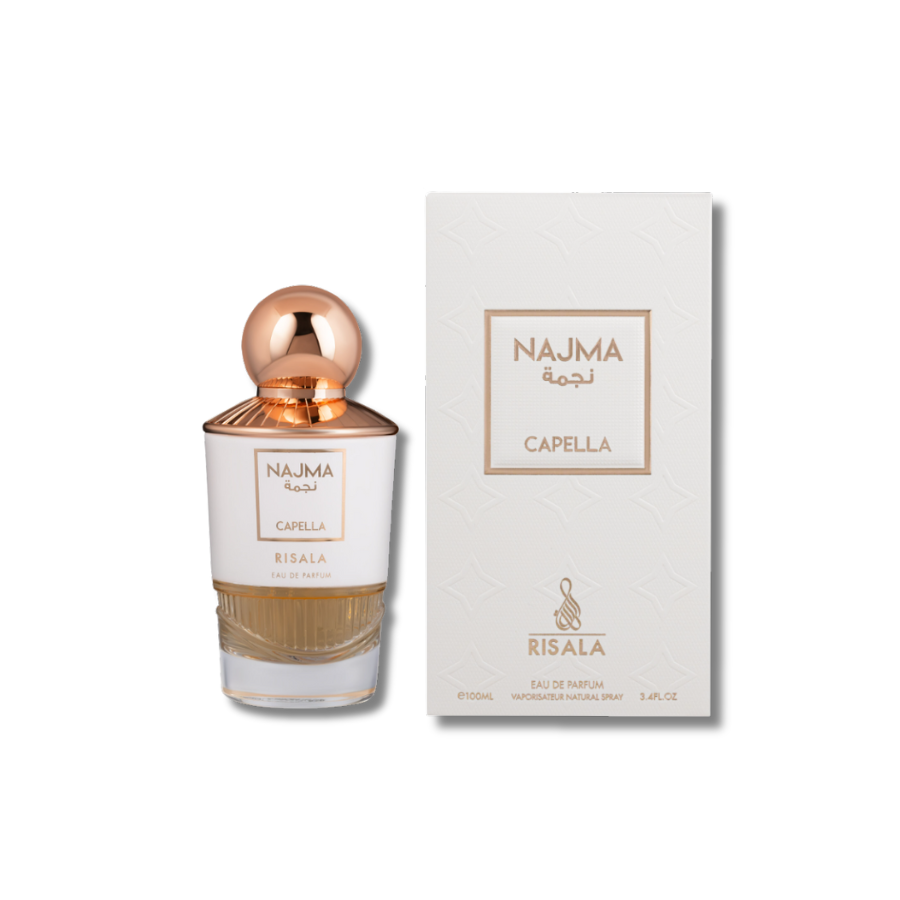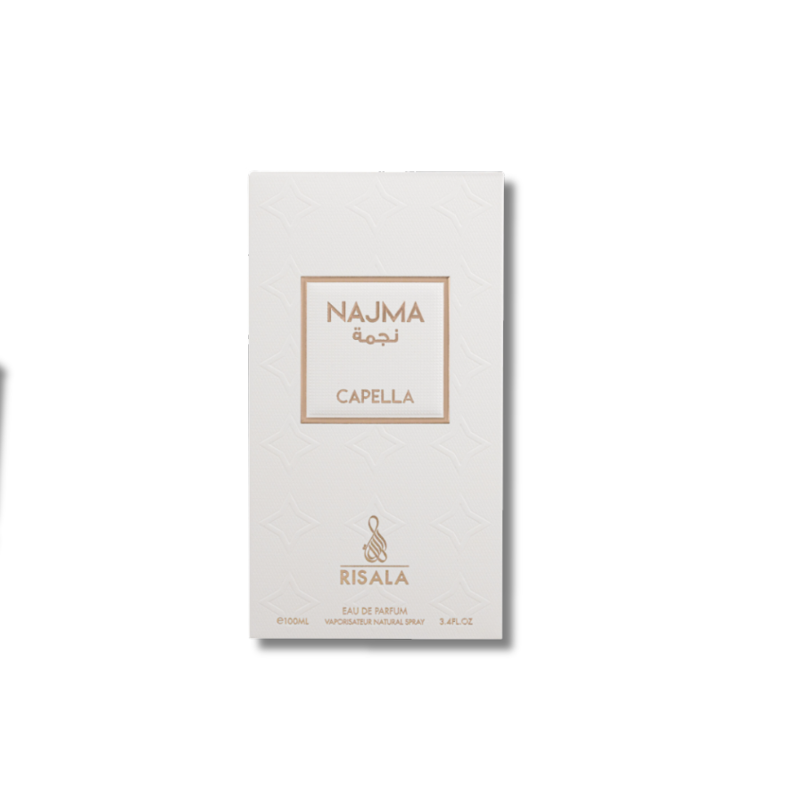 Embrace your playful elegance with Risala Najma Capella Eau de Parfum, a whimsical fragrance that captures the essence of sweet sophistication and confident individuality. Crafted for the modern woman, this scent is perfect for both daytime wear and evening occasions.