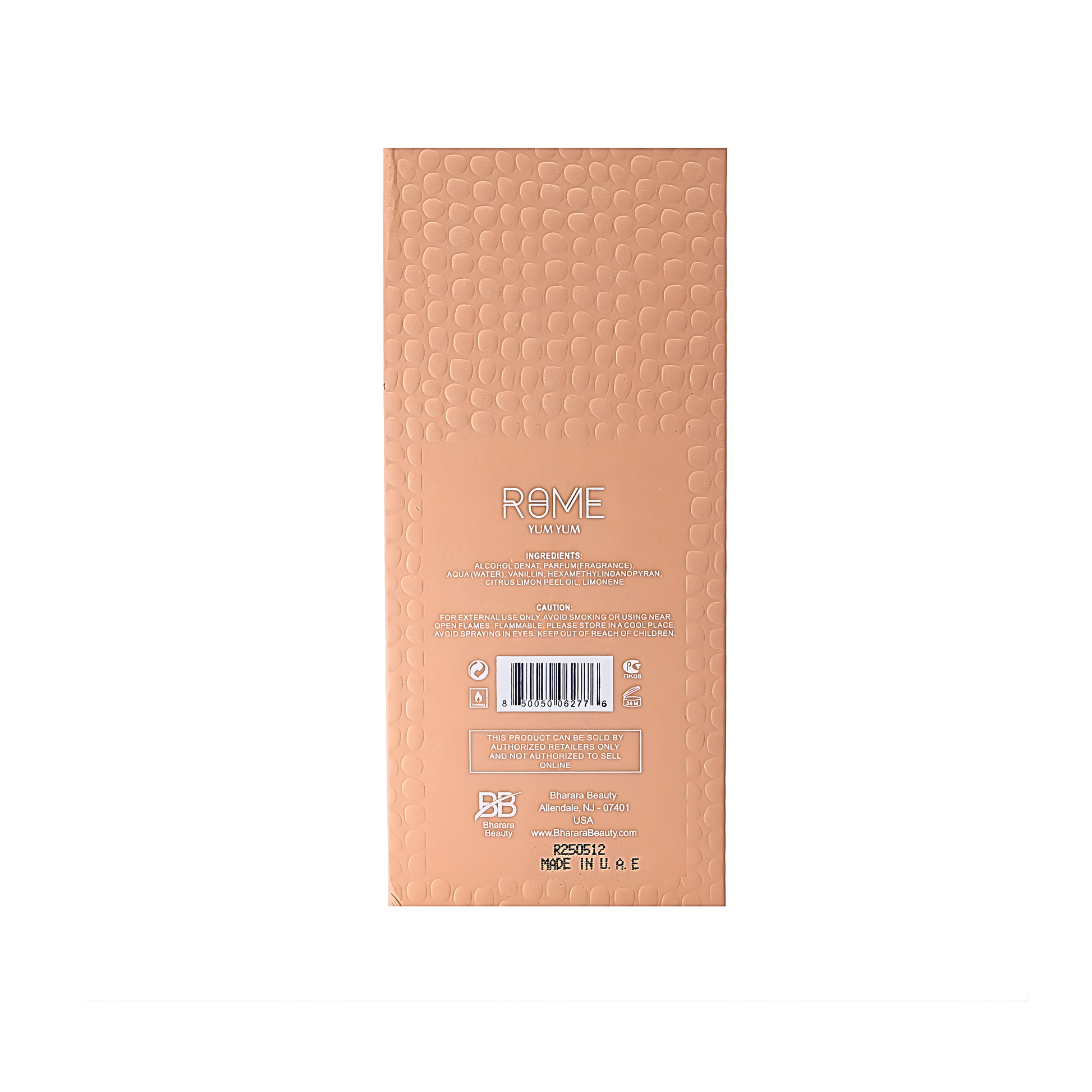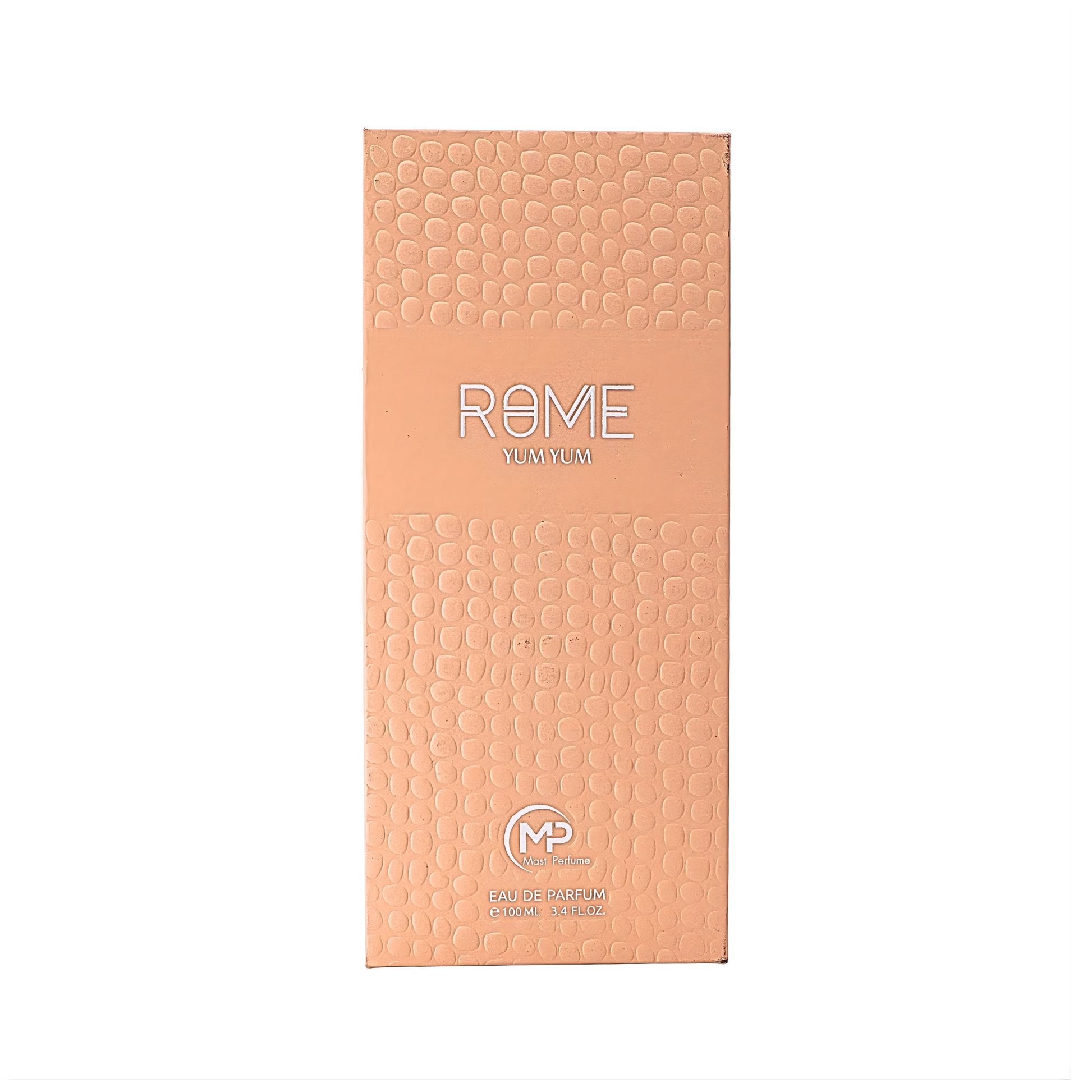 Rome Yum Yum Eau de Parfum (100 ml) — a sweet, feminine fragrance blending juicy red fruits and citrus, a floral heart, and a warm, gourmand base of vanilla, caramel, and woods. Playful, elegant, and perfect for day or night.