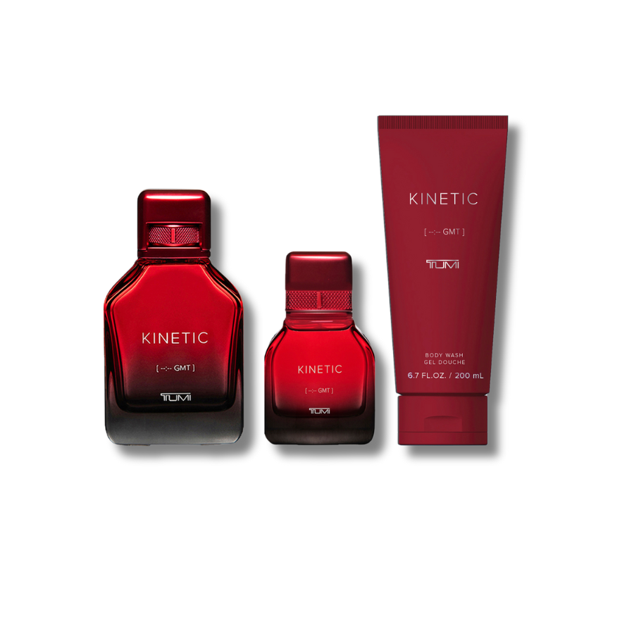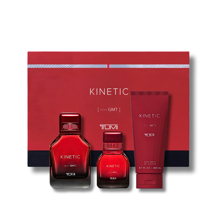 Indulge in the invigorating TUMI Kinetic Gift Set, including two sizes of Eau De Parfum and a luxurious body wash for a complete fragrance experience.